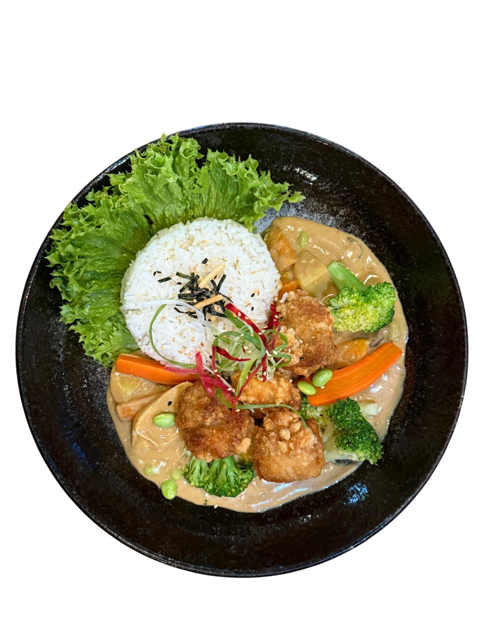 Japanischer Reis, Avocado, Gurke, 3 Stk Yakitori Spieße, 2 Stk Karaage, Miso Teriyaki-Soße, Kimchi-Sesam