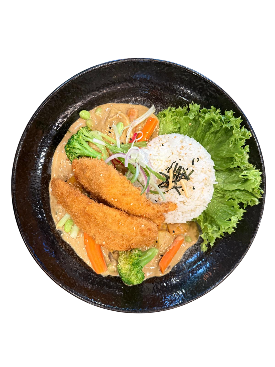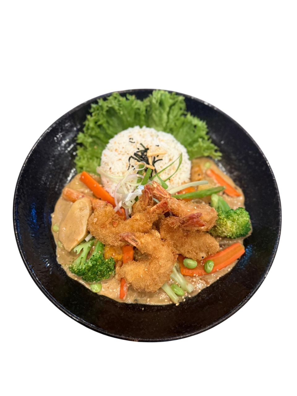Japanisches Curry mit Jasmin-Reis, Ebi Tempura, Kartoffeln, Karotten, Seidlingen, Brokkoli