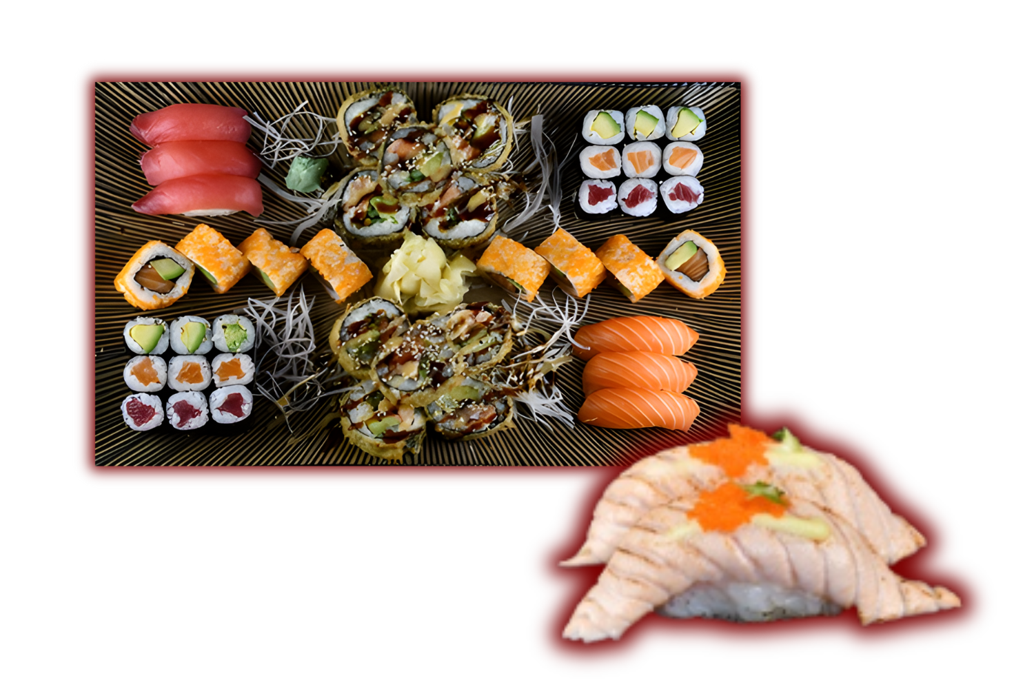 Nur für kurze Zeit: Unser Bestseller Menu für 2 Superior mit den flambierten Lachs Nigiri mit Mayo und Masago
