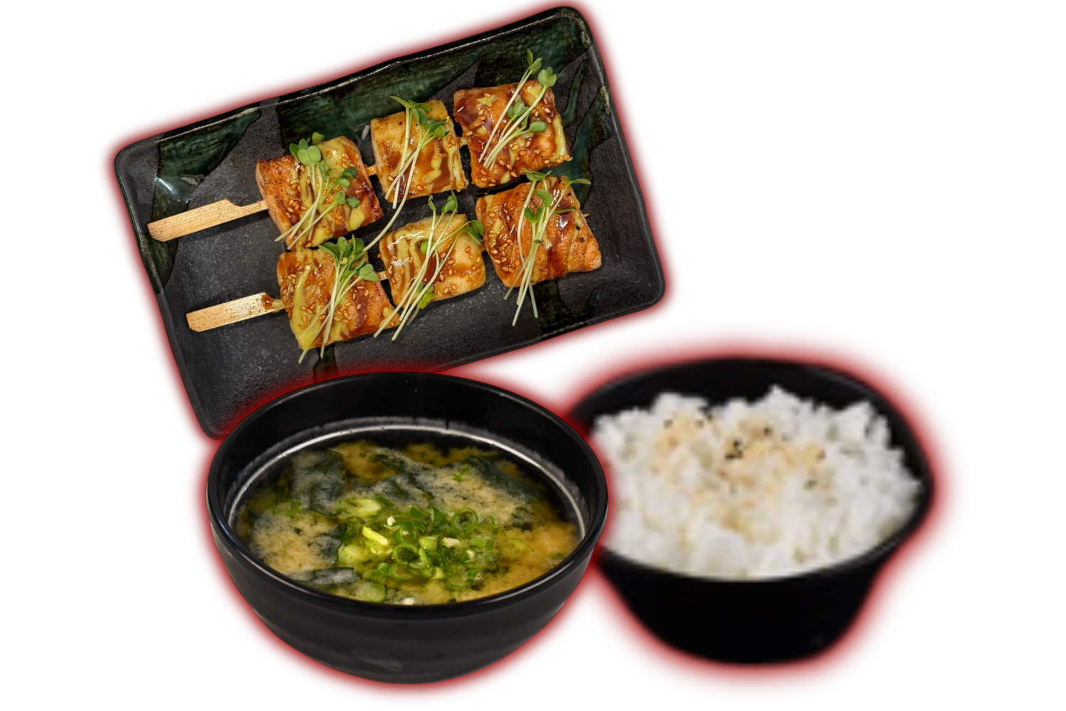Nur für kurze Zeit: Eine dezente Mahlzeit aus Lachs- und Butterfisch-Sticks, Weißer Reis und Miso Shiru