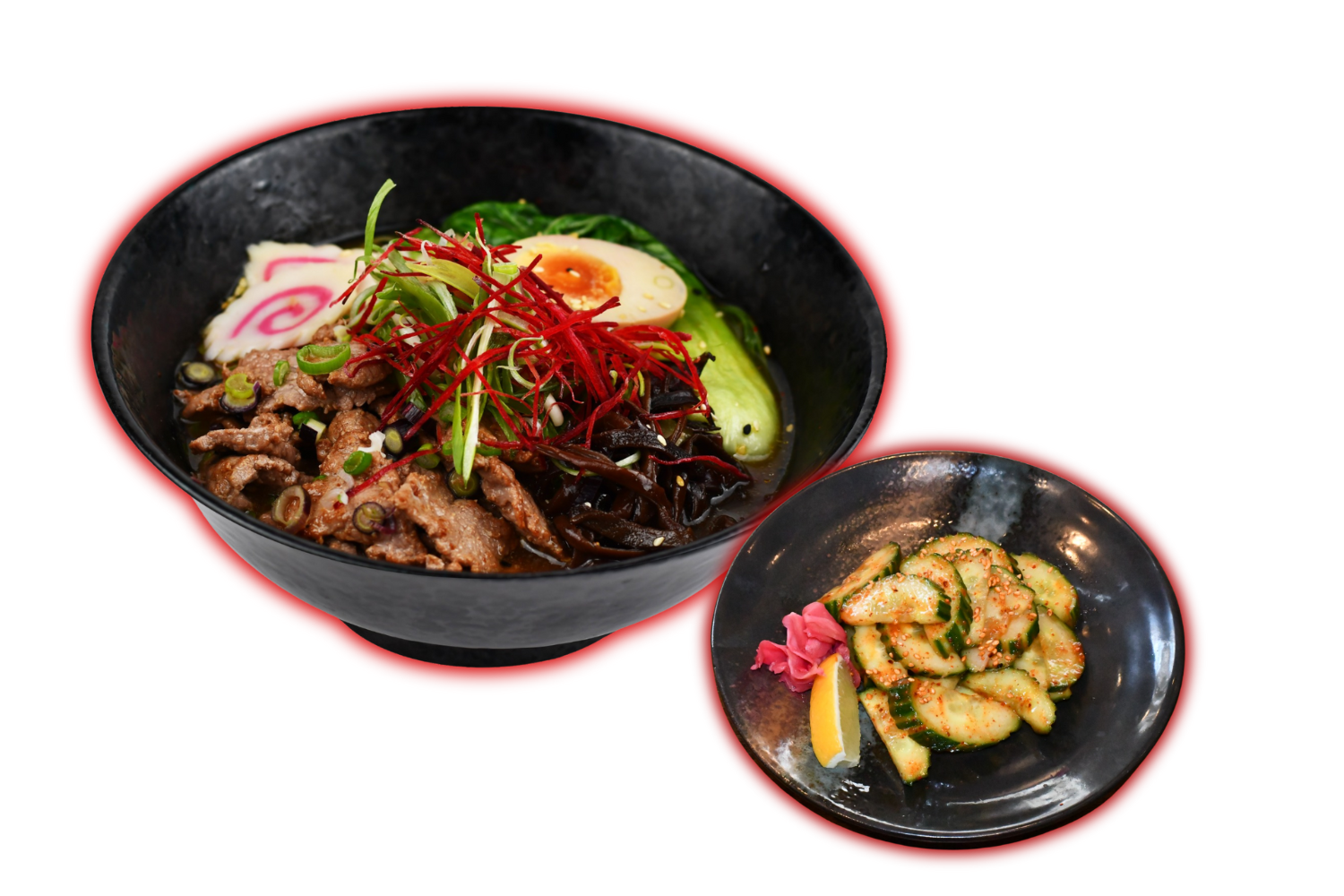Nur für kurze Zeit: Die beste Rindfleisch-Ramen mit unseren marinierten Gurken, Yuzu-Sauce, und Kimchi-Sesam